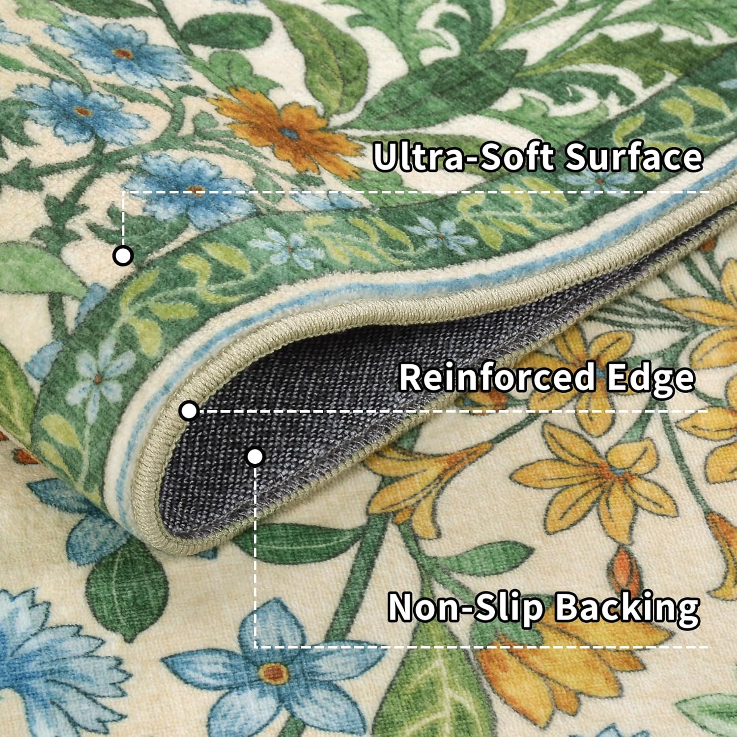 2x6 Washable Runner Rug,Grass Green Floral Boho Area Rug for Hallway,Low-Pile Non-Slip Stain Resistant Carpet for Kitchen, Bedside,Laundry Room,Entryway