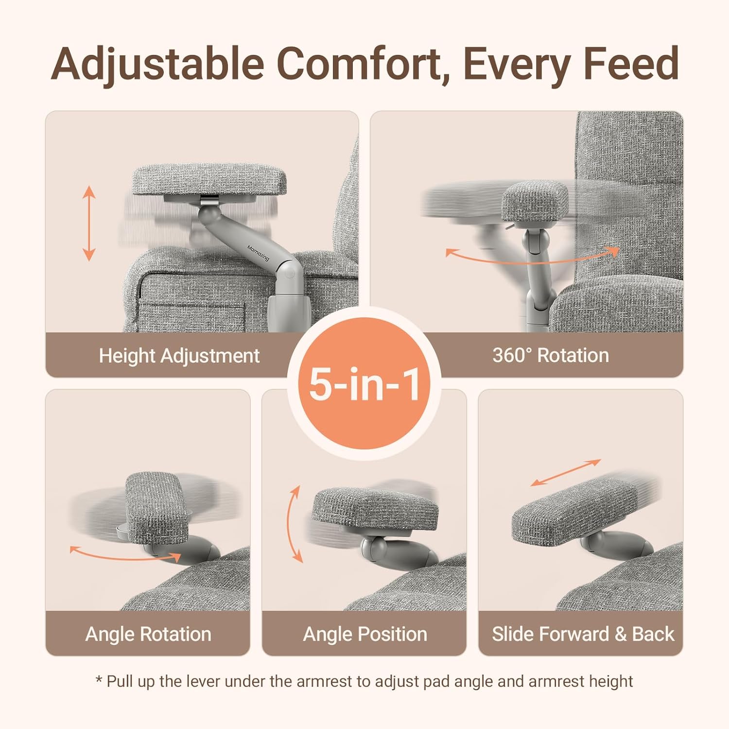 - 𝗠𝗔𝗠𝗔𝗭𝗜𝗡𝗚 𝗡𝗨𝗥𝗦𝗜𝗡𝗚 𝗖𝗛𝗔𝗜𝗥 𝘄𝗶𝘁𝗵 𝗔𝗗𝗝𝗨𝗦𝗧𝗔𝗕𝗟𝗘 𝗔𝗥𝗠𝗥𝗘𝗦𝗧𝗦, 𝗛𝗘𝗔𝗗𝗥𝗘𝗦𝗧 & 𝗙𝗨𝗟𝗟-𝗕𝗢𝗗𝗬 𝗦𝗨𝗣𝗣𝗢𝗥𝗧: Height-adjustable and 360° swivel armrests adapt to different nursing positions, helping moms hold their babies closer to the breast for a more natural latch. Nursa Plus Nursery chair creates a dynamic support system that adapts to your body. It precisely supports head, arms, waist, and legs to reduce fatigue during long nursing or sitting sessions
