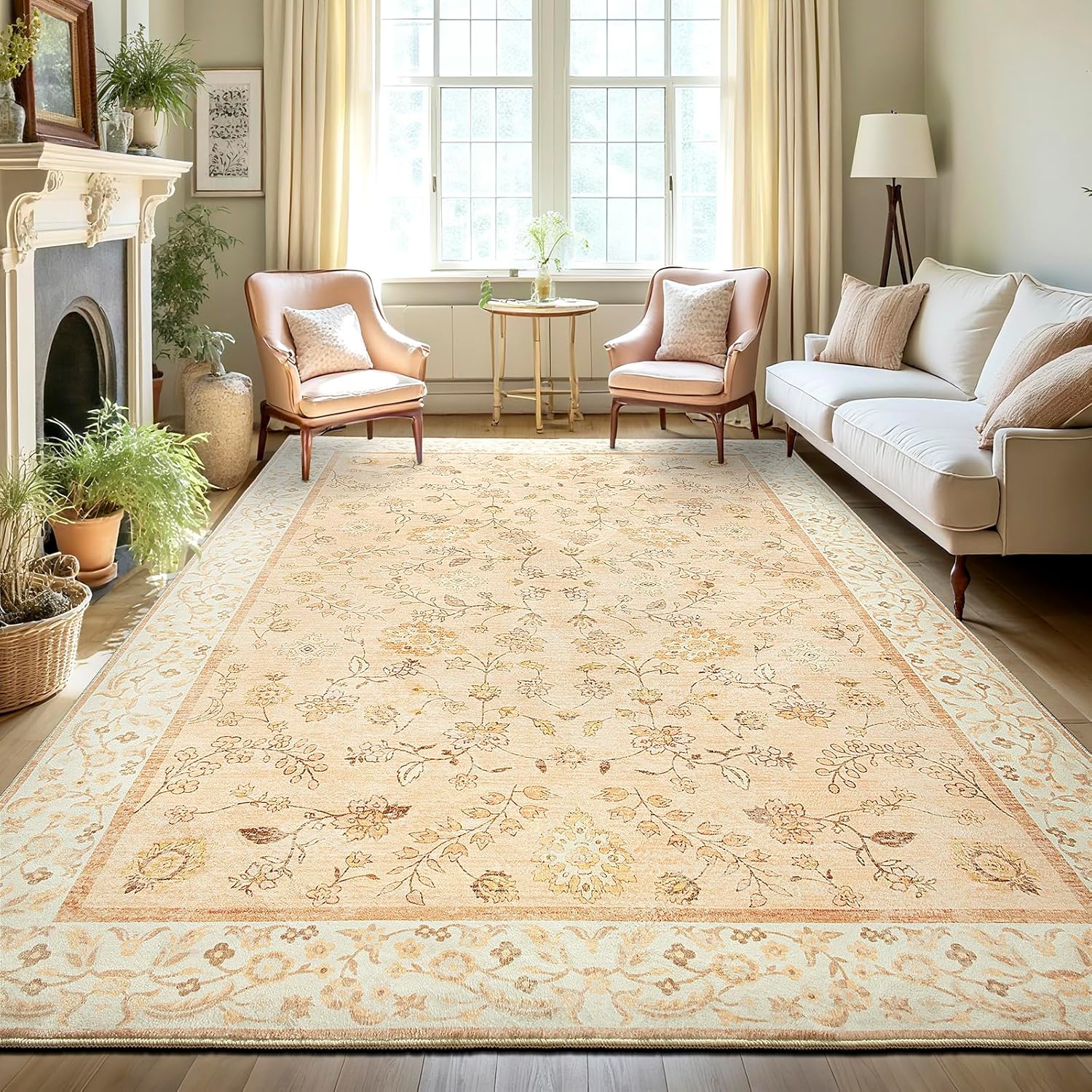 LOCHAS Washable Area Rugs 4x6, Peach Floral Rug for Living Room Bedroom Non Slip, Ultra Soft Vintage Indoor Carpet for Kids, Nursery, Dorm, Dining Room, Classroom, Boho Flower Home Decor, Low-Pile