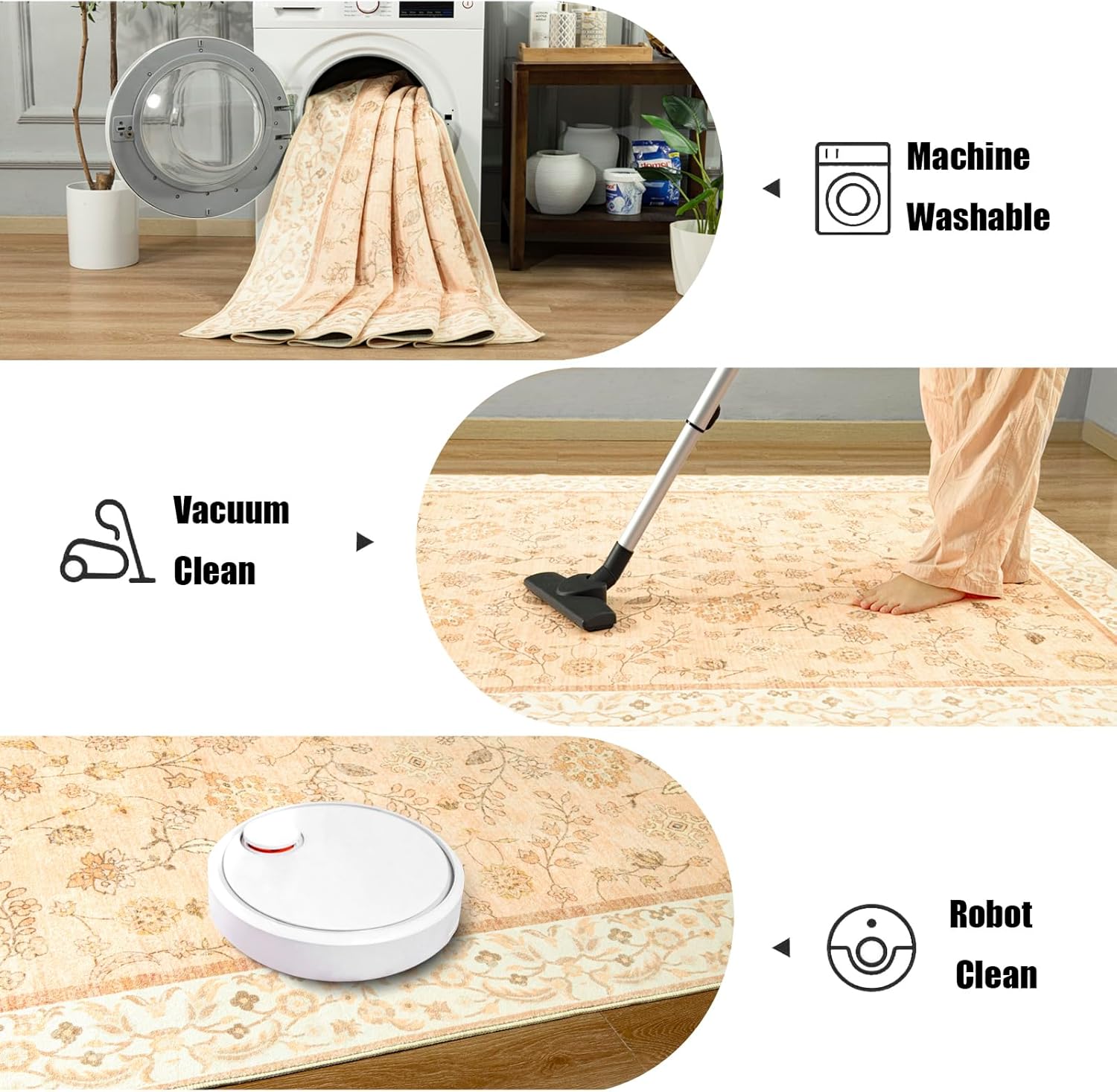 LOCHAS Washable Area Rugs 6x9, Peach Floral Rug for Living Room Bedroom Non Slip, Ultra Soft Vintage Indoor Carpet for Kids, Nursery, Dorm, Dining Room, Classroom, Boho Flower Home Decor, Low-Pile