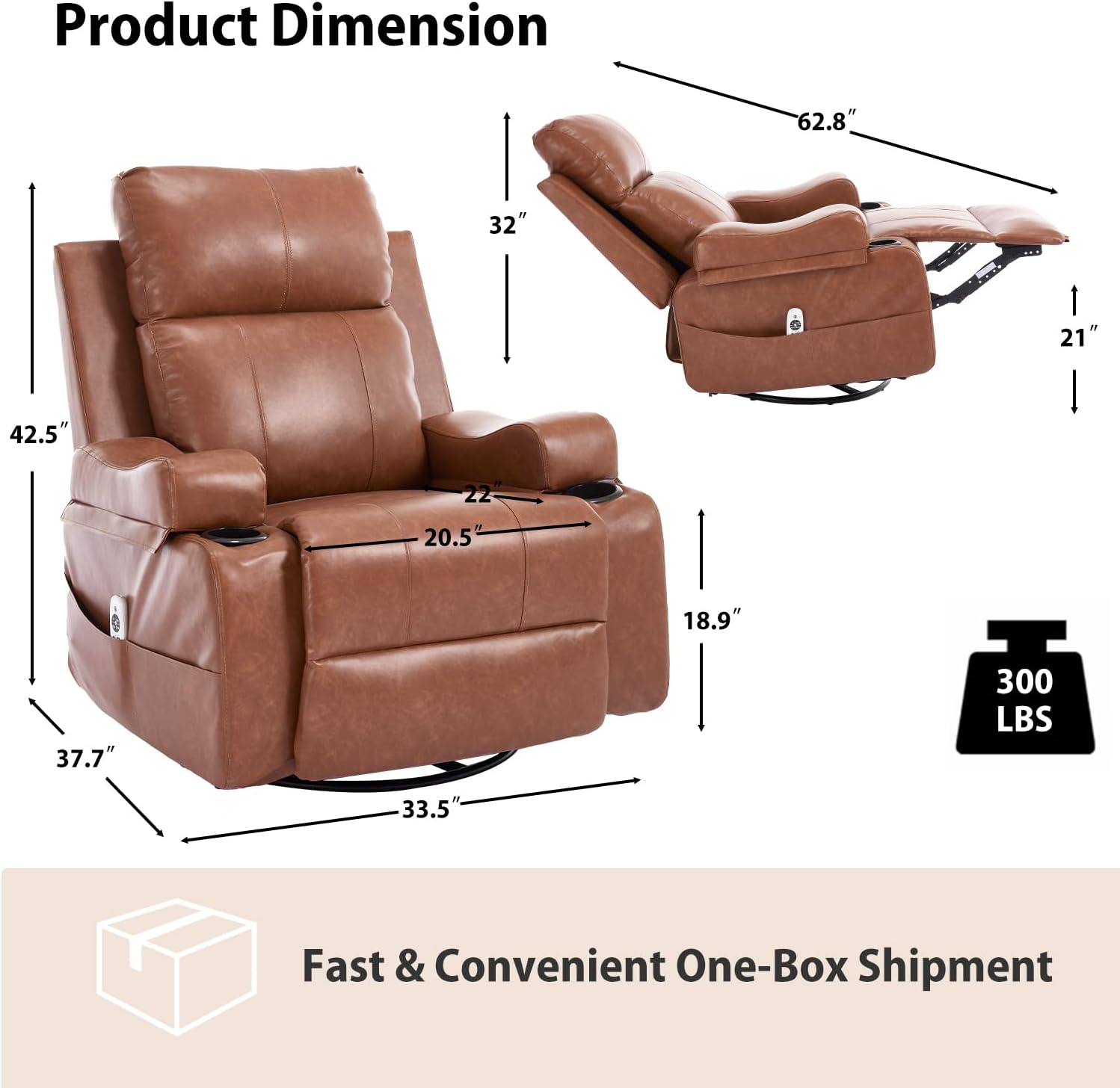KCQ Electric Massage Recliner Chairs with Heat Overstuffed Faux Leather Power Rocking Reclining Chair with Cup Holders for Adults, Swivel Rocker Recliner Brown
