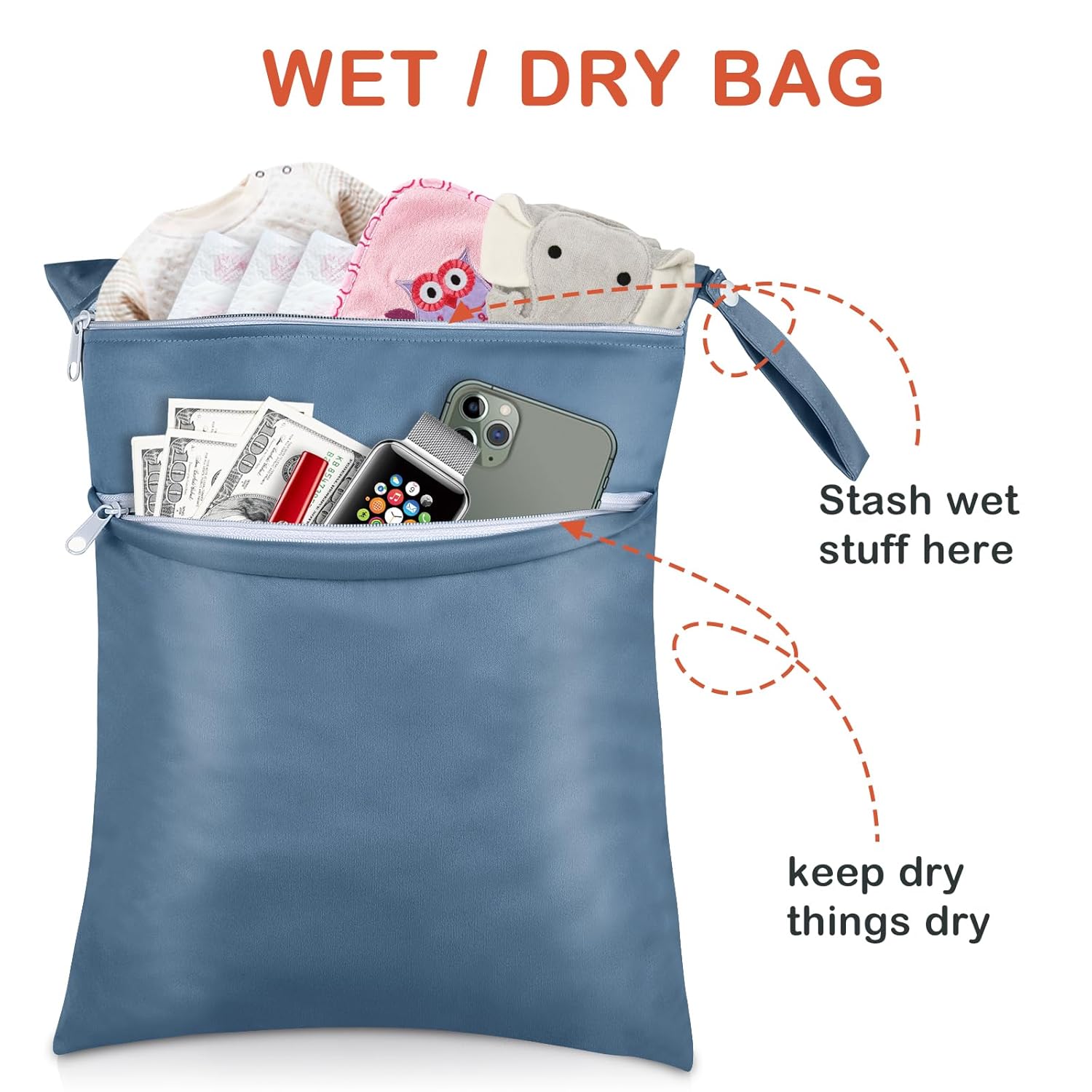 - Come with TWO zip closures to ensure that nothing will drop out of the bag and keep the clean and dirty diapers separately. Also comes with durable handle for easy carrying or attaching to your diaper bag or stroller.