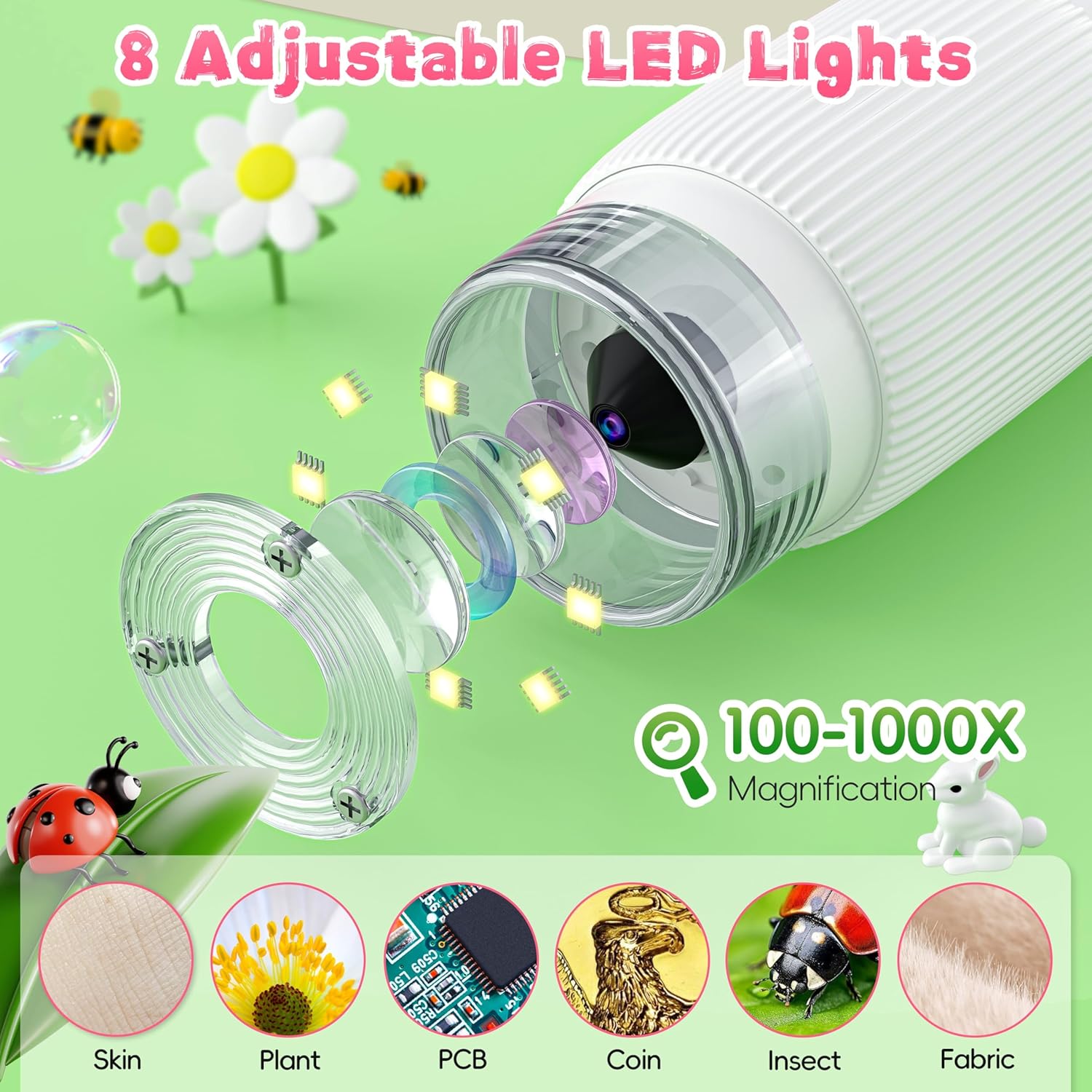 - High-Resolution Imaging: Equipped with a high-definition camera lens and 8 adjustable LED lights, this children's microscope ensures optimal viewing in any lighting. Three distinct lighting modes provide excellent clarity, sparking curiosity and encouraging exploration.