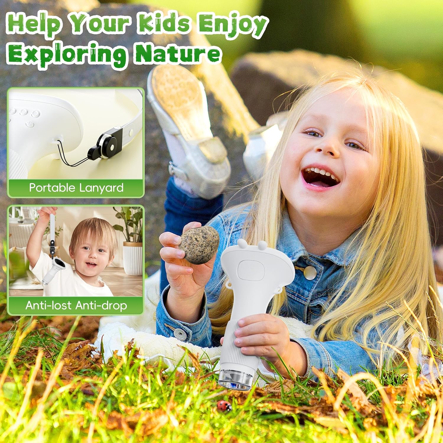 - Portable & Mini Design: Designed for on-the-go science, this compact microscope includes a removable screen protector and a ~20-inch (~50cm) neck strap for easy carrying, drop protection, and prevention of loss. Its lightweight build fits comfortably in children's hands, adding fun and convenience to scientific adventures anytime, anywhere.