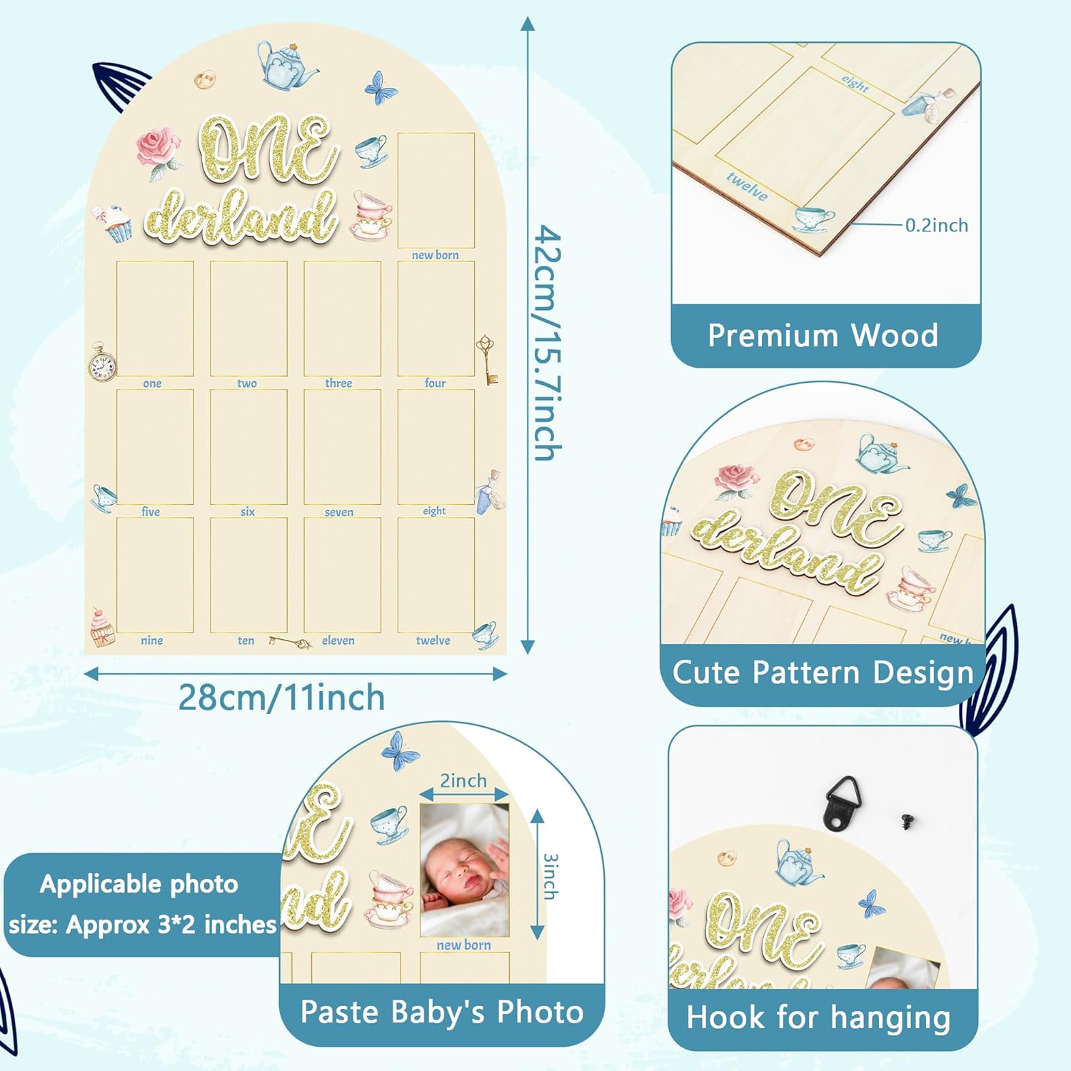 - Onederland Tea Party Display Wood Board: Our 1st Birthday Frame comes with hanging hooks and adhesive points, making it easy for you to mount and decorate. Crafted from durable, premium wood, it's designed for longevity. Adorned with your baby's photo, this onederland tea party frame will undoubtedly become a stunning focal point at your child's first birthday celebration.