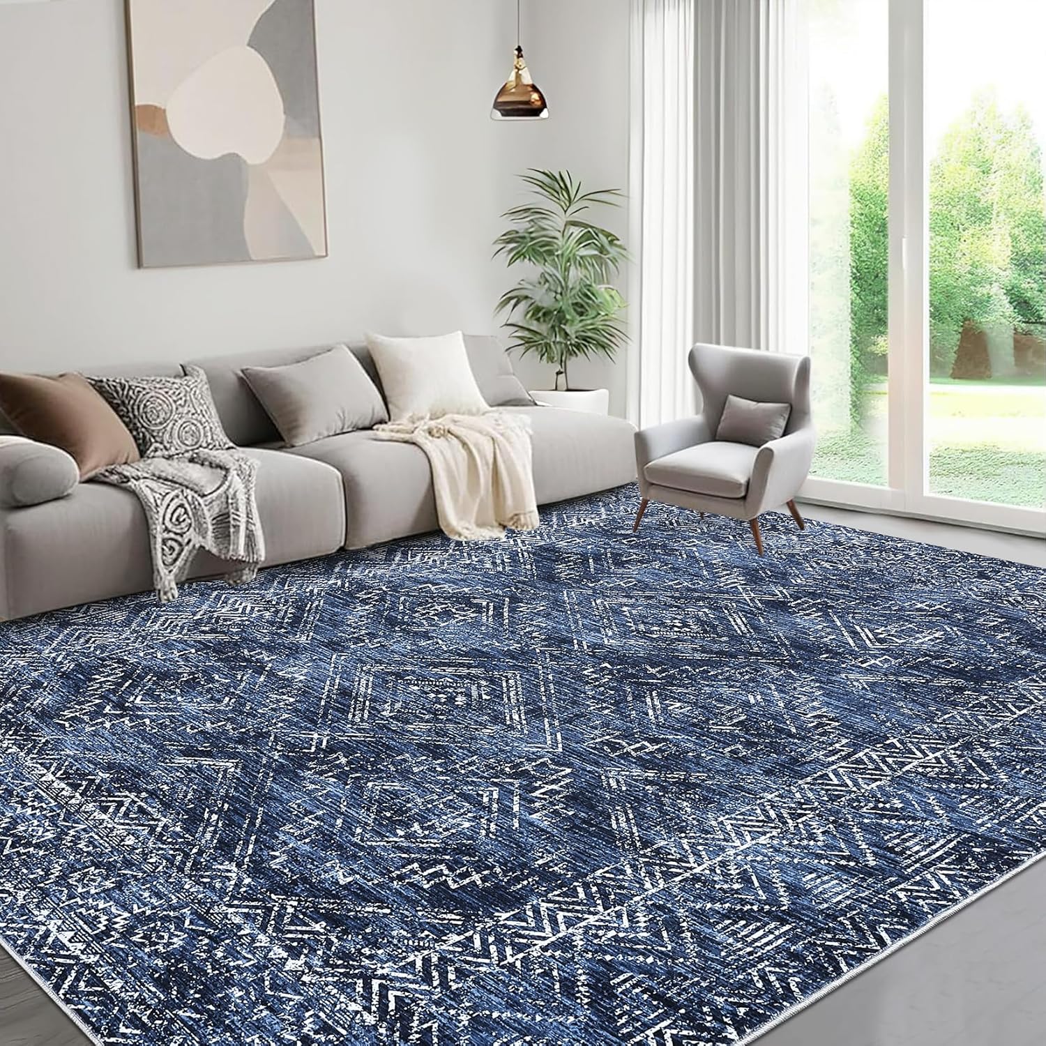 COZYLOOM Washable Area Rugs 10x13 Vintage Non Slip Low Pile Rug Soft Throw Floor Cover Geometric Tribal Foldable Indoor Carpet for Living Room Bedroom Playroom Nursery, Blue