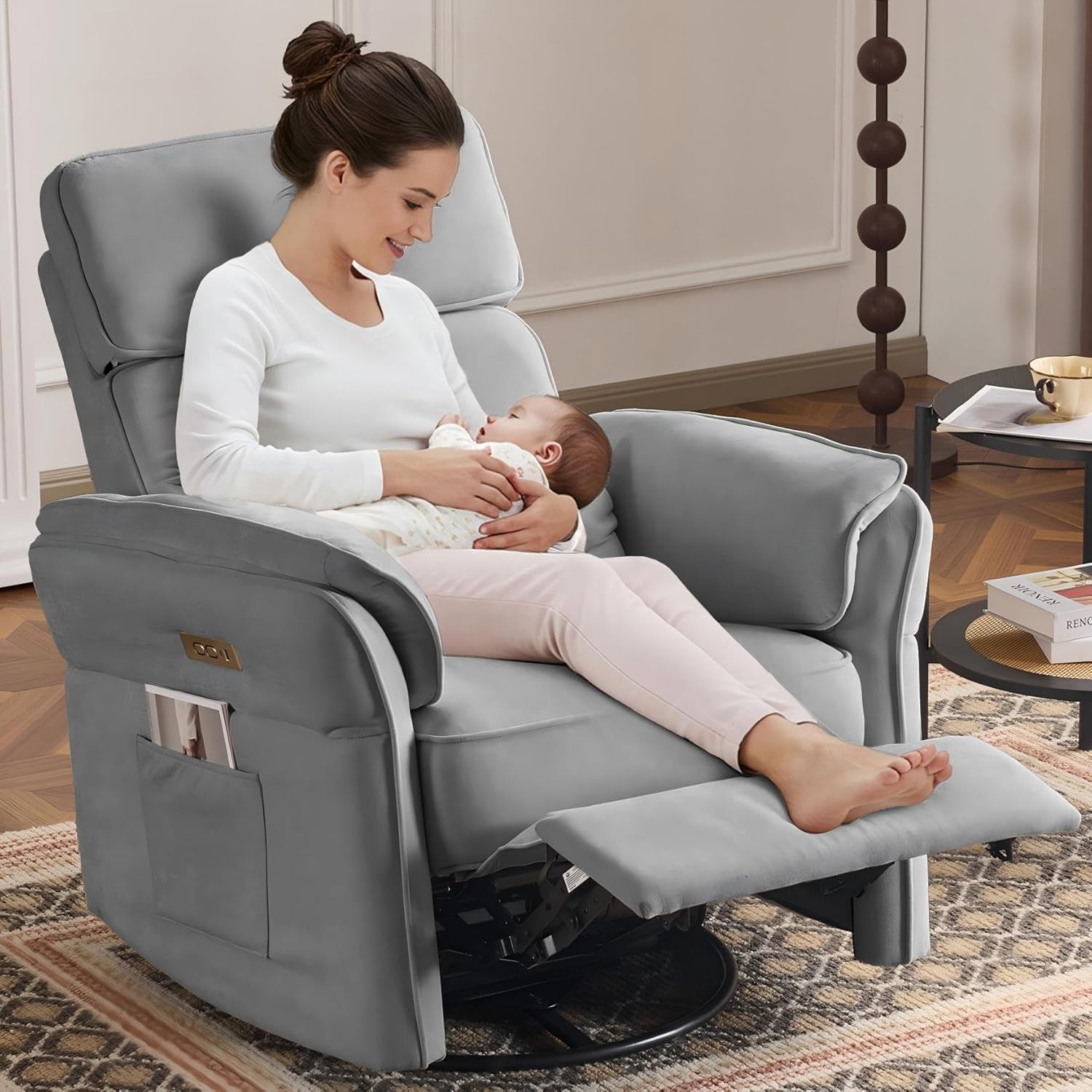 - [Swivel and Rocking Motion]The power glider swivel rocker recliner chair is designed with Mom's comfort in mind, featuring a 270-degree swivel and 90-145° recliner angle, silent gliding mechanism with one-touch operation, offers flexibility and versatility for maximum comfort, plus includes an extended footrest for complete relaxation, making it perfect for activities such as watching television, sleeping, and reading.