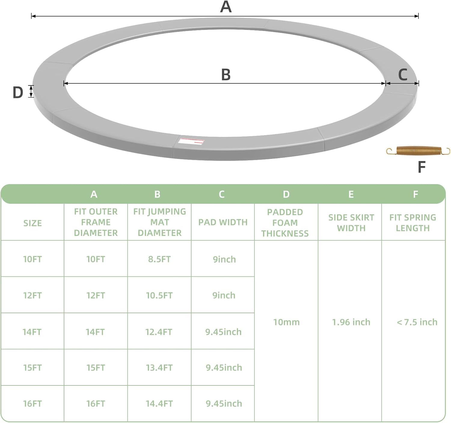 • 【Rich Configuration】Our trampoline mats come in four colors: blue, black, purple, and gray, and five sizes: 10ft, 12ft, 14ft, 15ft, and 16ft, to meet the needs of most trampolines.