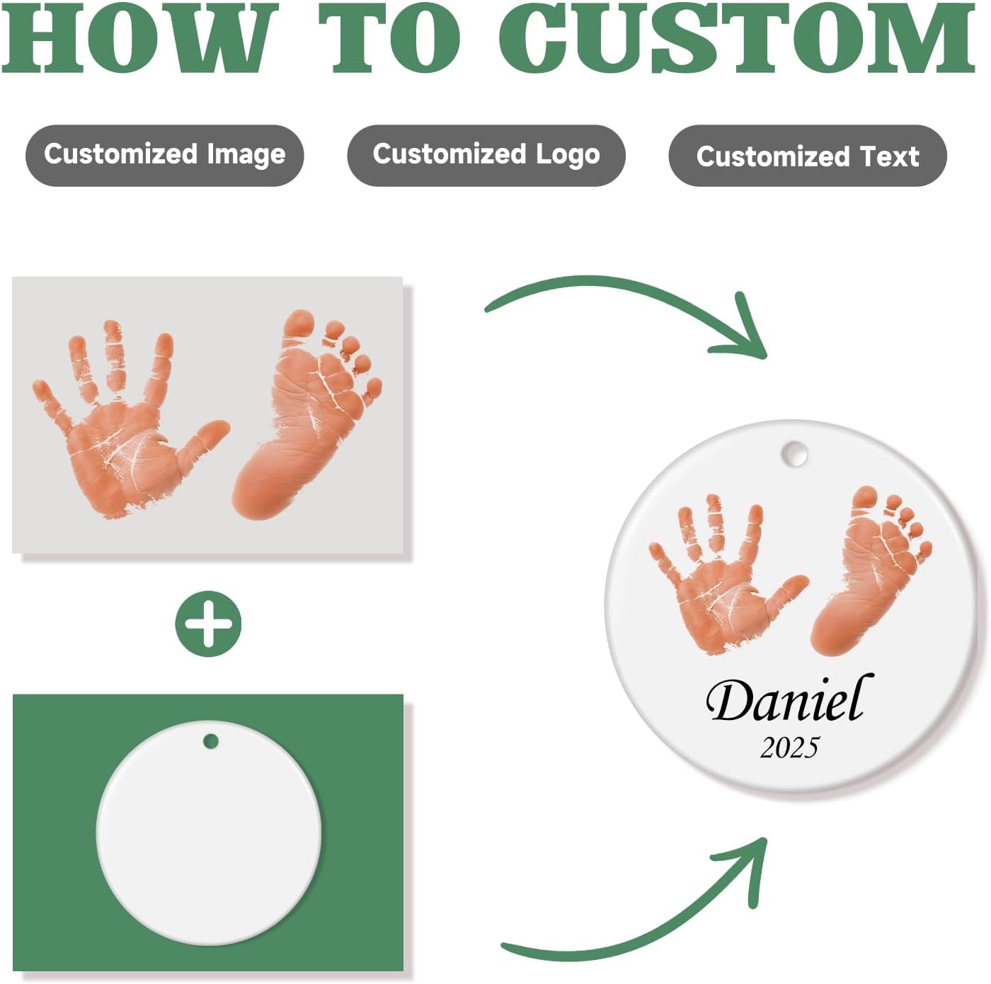 - FIRST CHRISTMAS ORNAMENT: Click "Customize Now" to upload a photo of your baby's handprint/footprint, add name and date. This personalized ornament is perfect for commemorating your baby’s first Christmas. It is suitable for both boys and girls. Personalizing your own ornament and celebrating baby's first Christmas with this cherished baby's first Christmas ornament 2025.