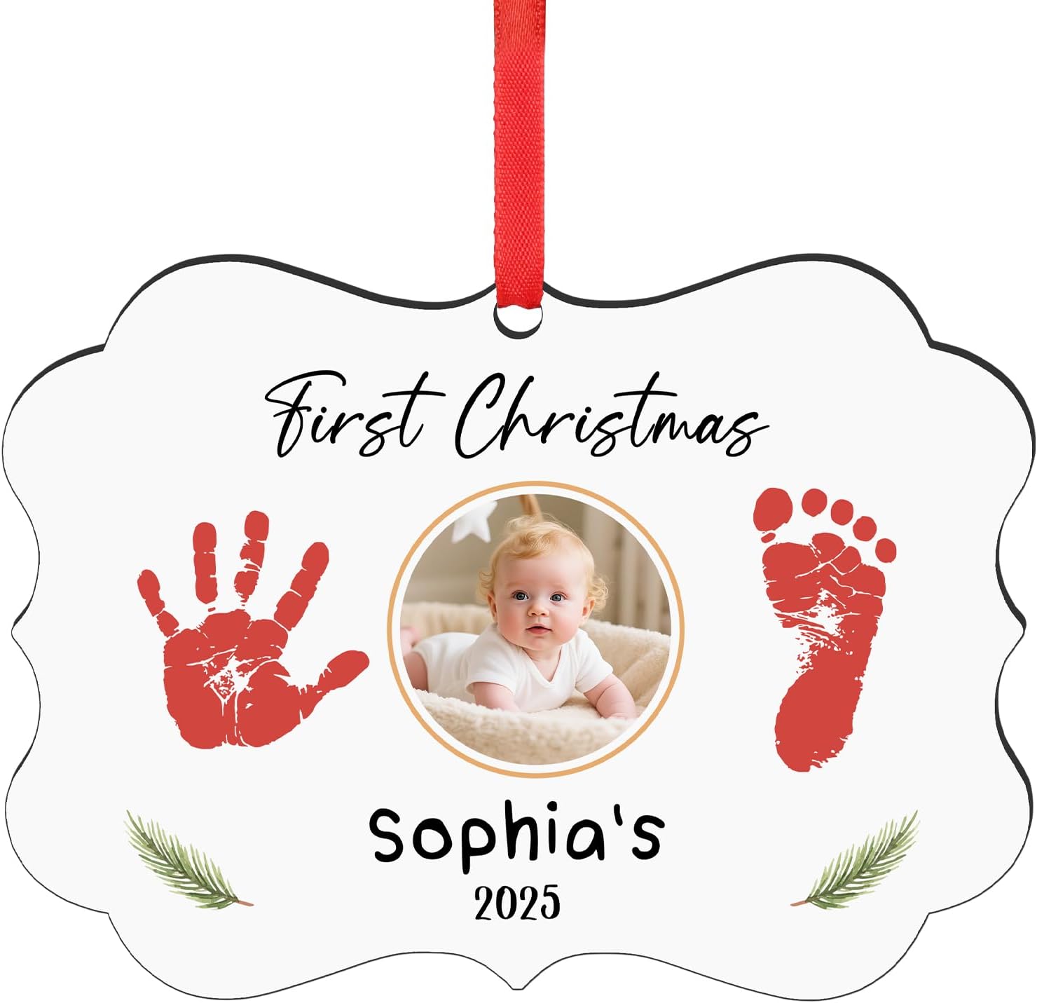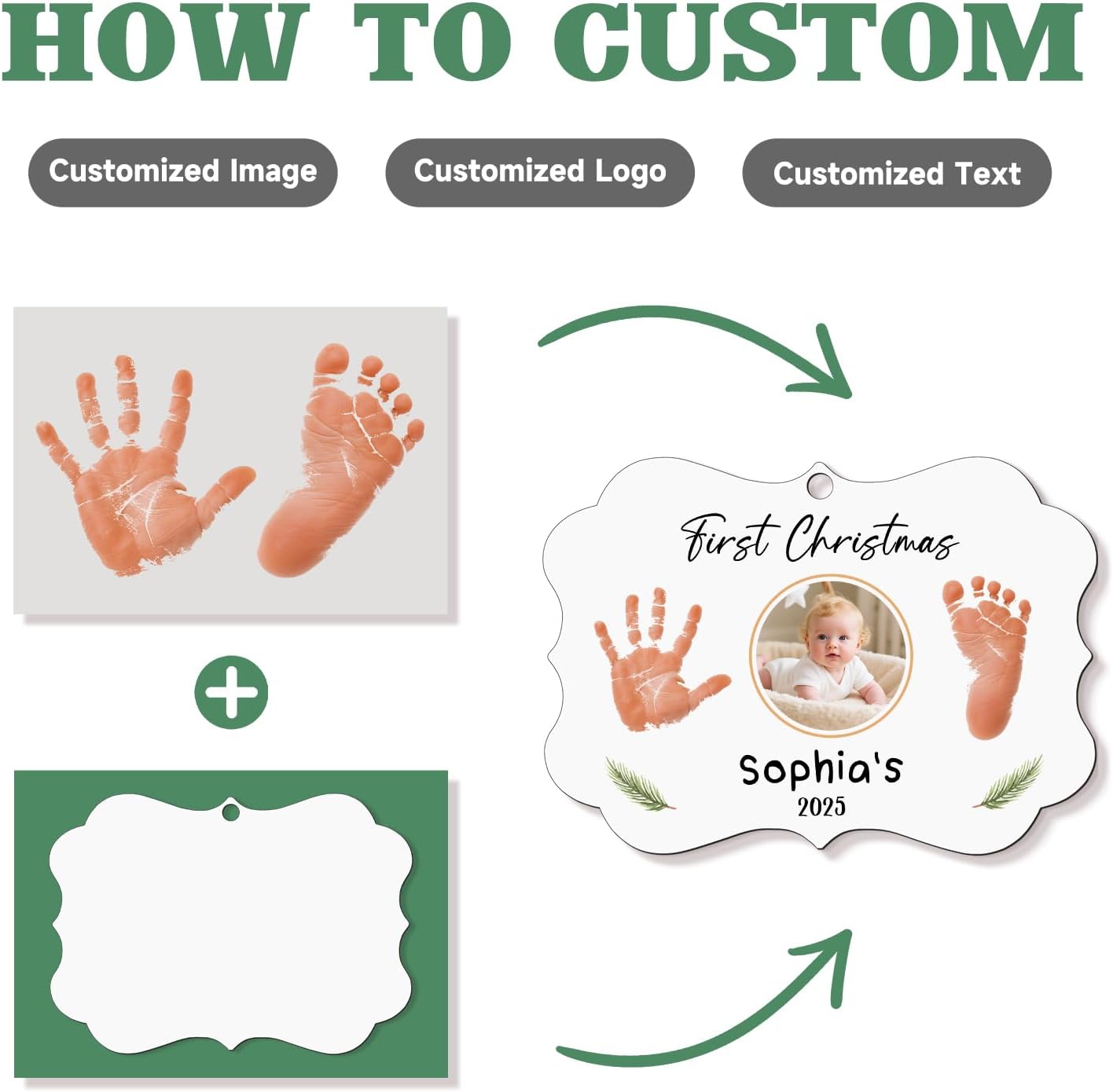 - FIRST CHRISTMAS ORNAMENT: Click "Customize Now" to upload a photo of your baby's handprint/footprint, add name and date. This personalized ornament is perfect for commemorating your baby’s first Christmas. It is suitable for both boys and girls. Personalizing your own ornament and celebrating baby's first Christmas with this cherished baby's first Christmas ornament 2025.