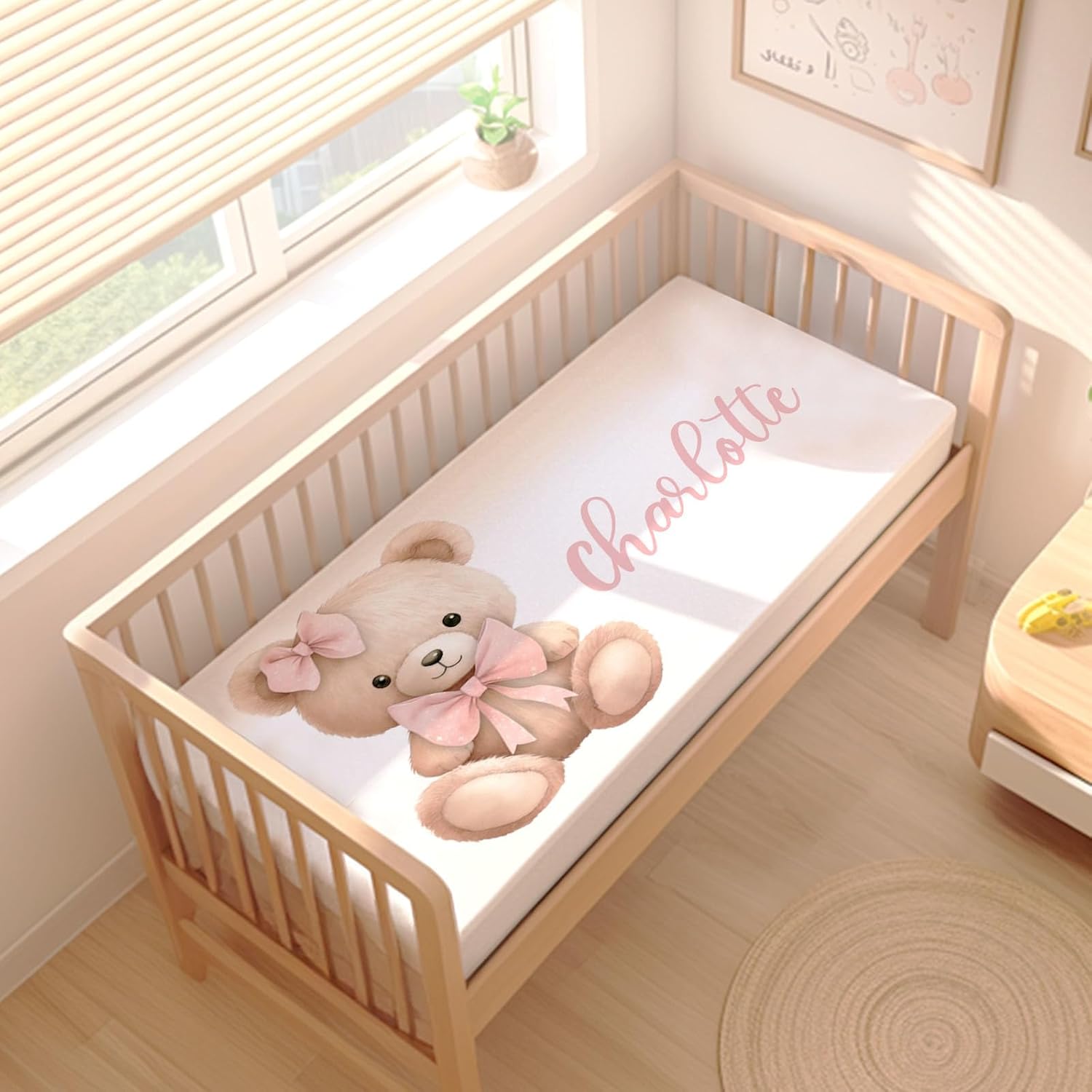 Custom Name Baby Girl Crib Bedding Set – Personalized 3-Piece Bear with Pink Bow Nursery Set with Soft Blanket, Fitted Crib Sheet & Pillowcase – Infant Toddler Bedding Gift for Newborn