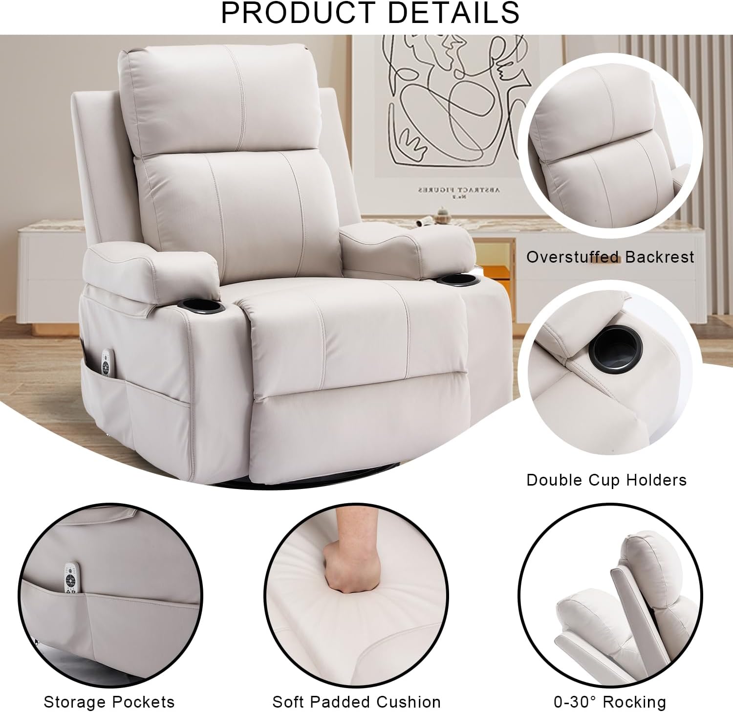 KCQ Electric Swivel Recliner Chair with Massage Heat Cup Holders Overstuffed PU Leather Power Rocking Glider Chairs Rocker Recliner for Adults, Beige